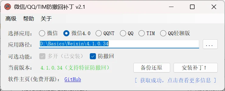 该软件是绿色免安装,最新v2.0版本支持微信4.0,打开该软件,根据你的需求选择对用应用安装对应功能的补丁即可。