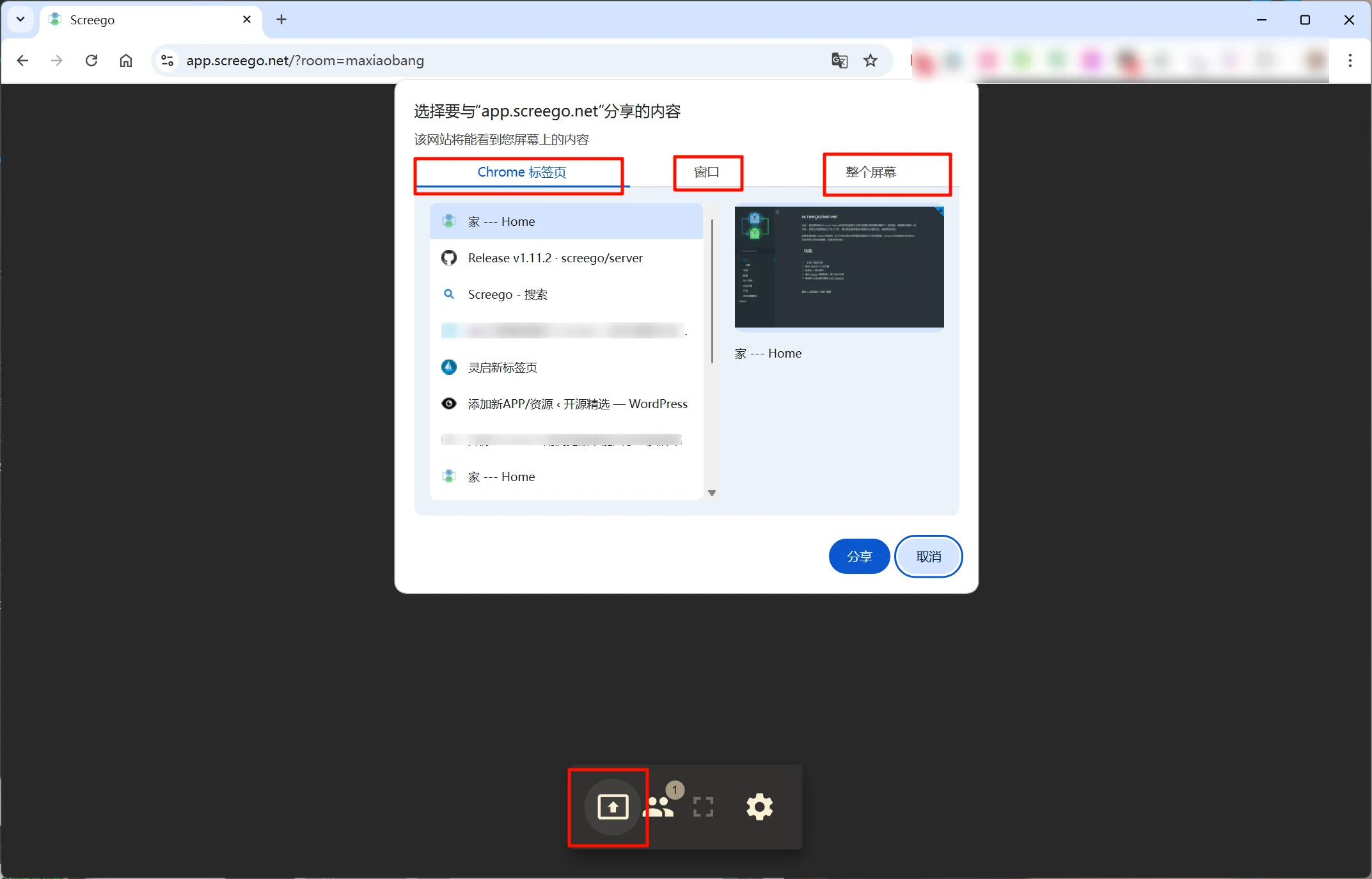 点击底部菜单栏的第一个按钮,你就选择分享浏览器的任意网页、电脑窗口、或者整个电脑屏幕。