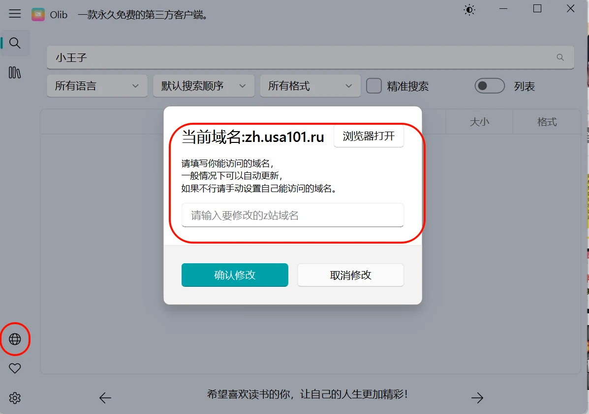 2025年11月27日 最新版O-lib2.4.3 作者将该工具改为zlibrary的第三方客户端,需要你填写你当前可访问的域名,然后再登录你的zlibrary账号才可以进行下载。