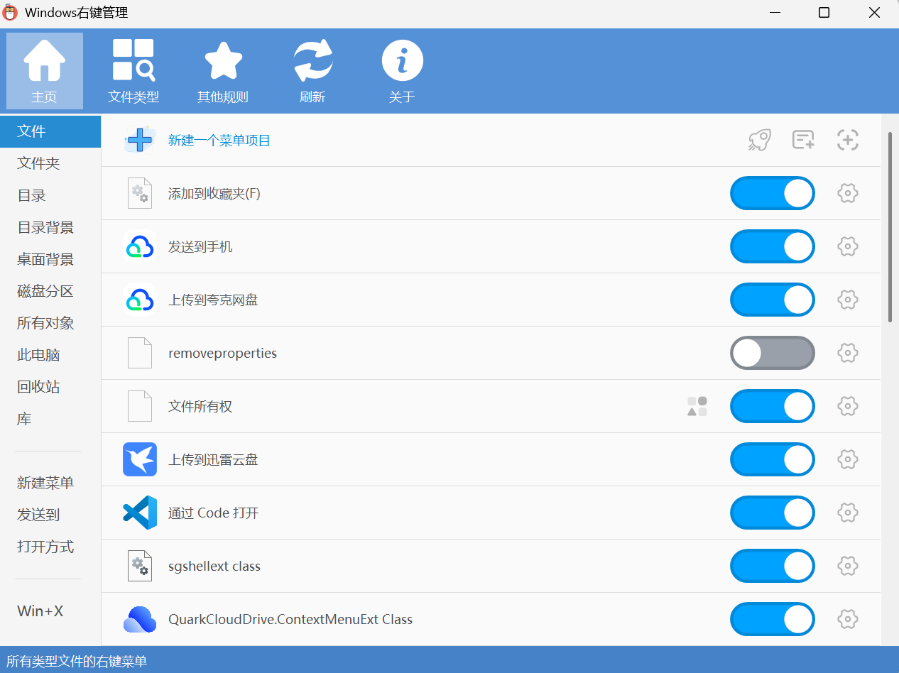 ContextMenuManager(Windows右键管理)是一款纯粹的Windows系统右键菜单管理工具,他可以开启和关闭Windows系统中的文件、文件夹、新建、发送到、打开方式、自定义文件格式、IE浏览器、WinX等右键菜单项目中的选项。