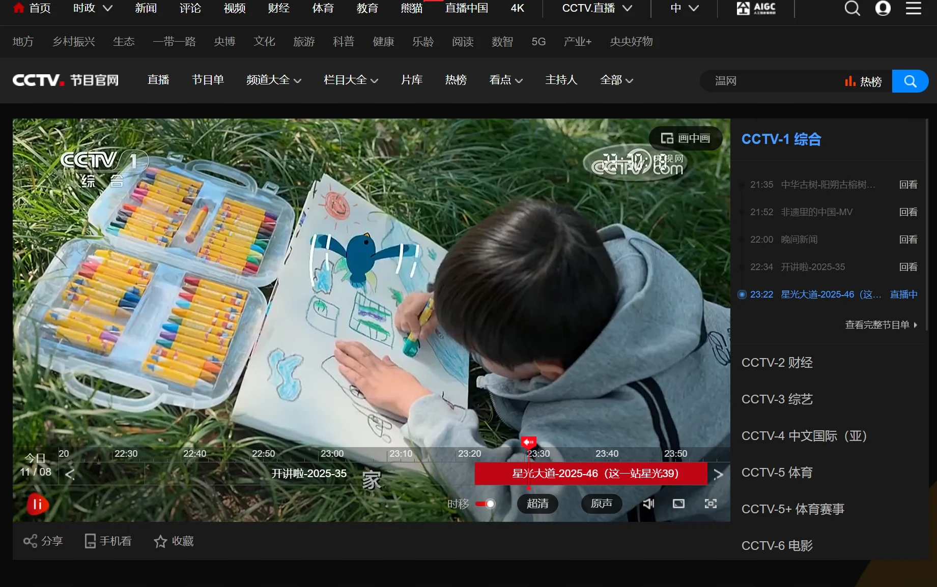电视直播支持观看 CCTV 及各地卫视的官网直播。