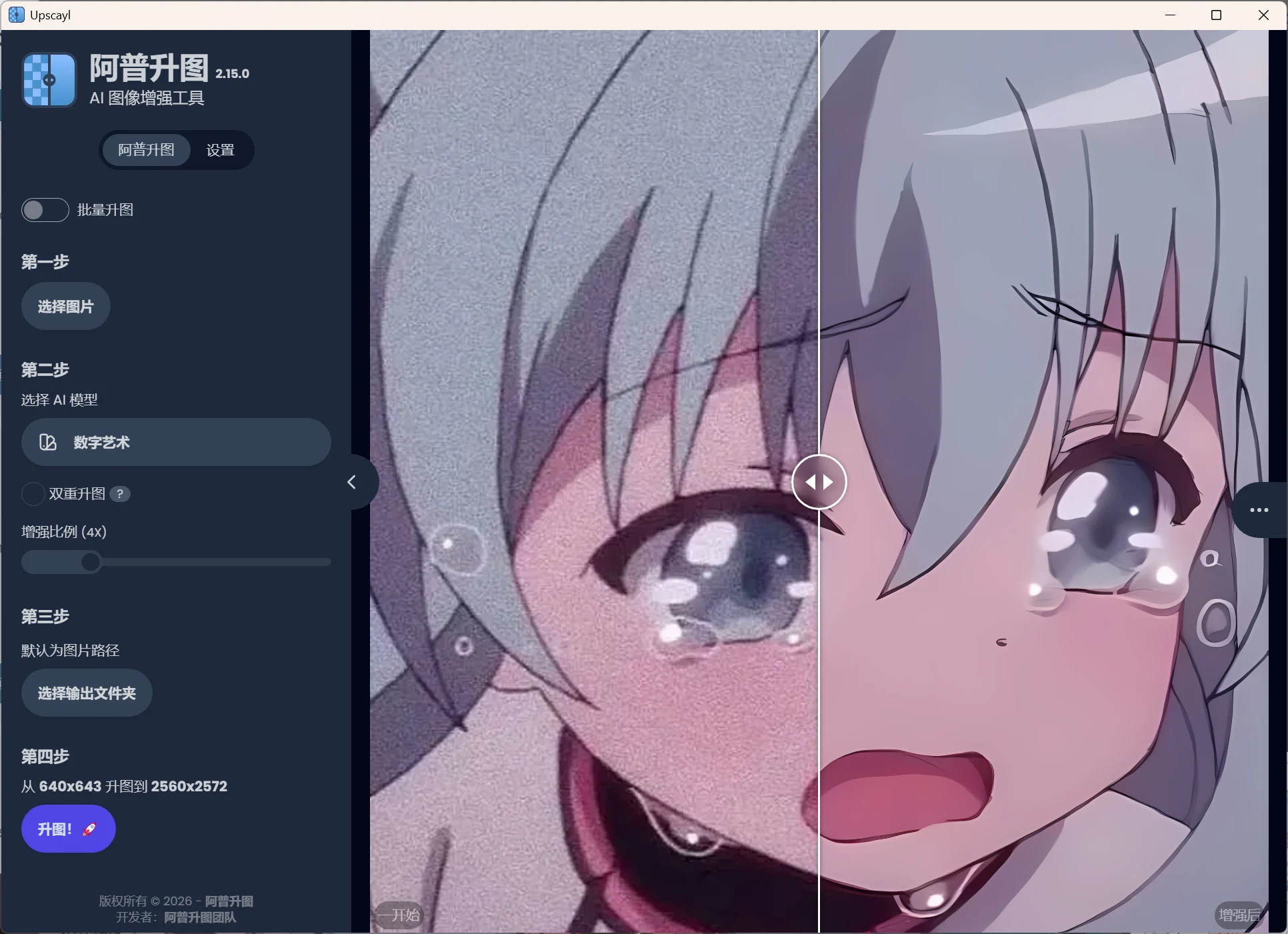 Upscayl 是一款免费、开源的 AI 图像放大工具。它的核心逻辑是利用先进的人工智能模型(如 Real-ESRGAN)来修补像素,从而在不损失画质(甚至提升画质)的前提下,将低分辨率图片放大 4 倍甚至更多。